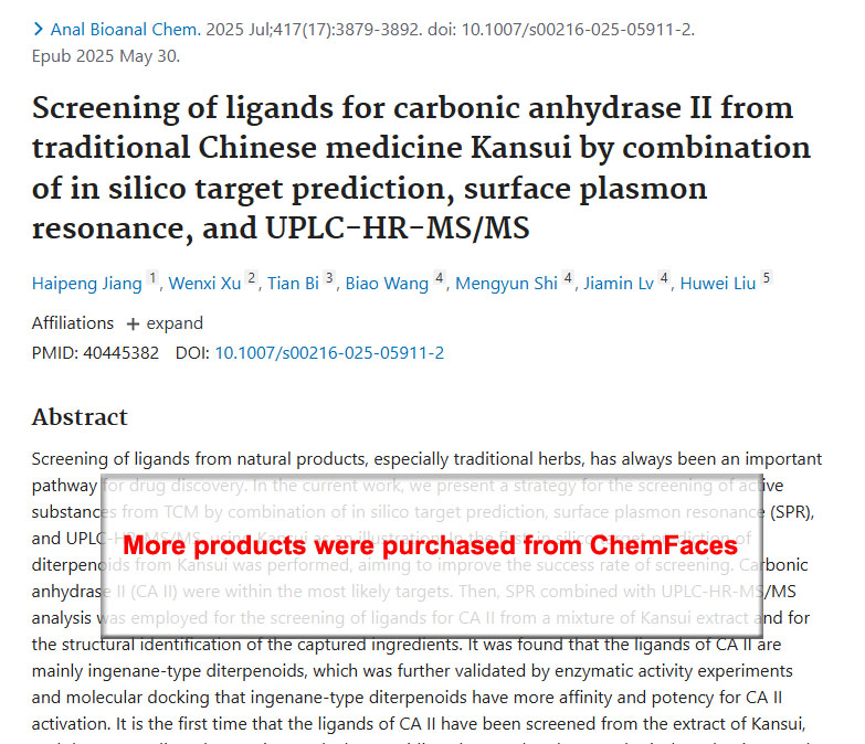 • Screening of ligands for carbonic anhydrase II from traditional Chinese medicine Kansui by combination of in silico target prediction, surface plasmon resonance, and UPLC-HR-MS/MS