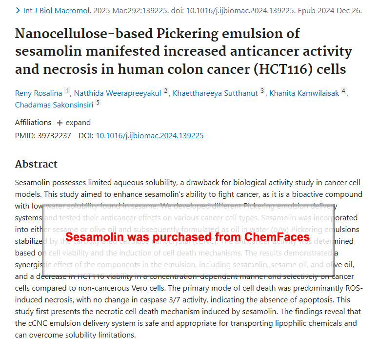 • Nanocellulose-based Pickering emulsion of sesamolin manifested increased anticancer activity and necrosis in human colon cancer (HCT116) cells
