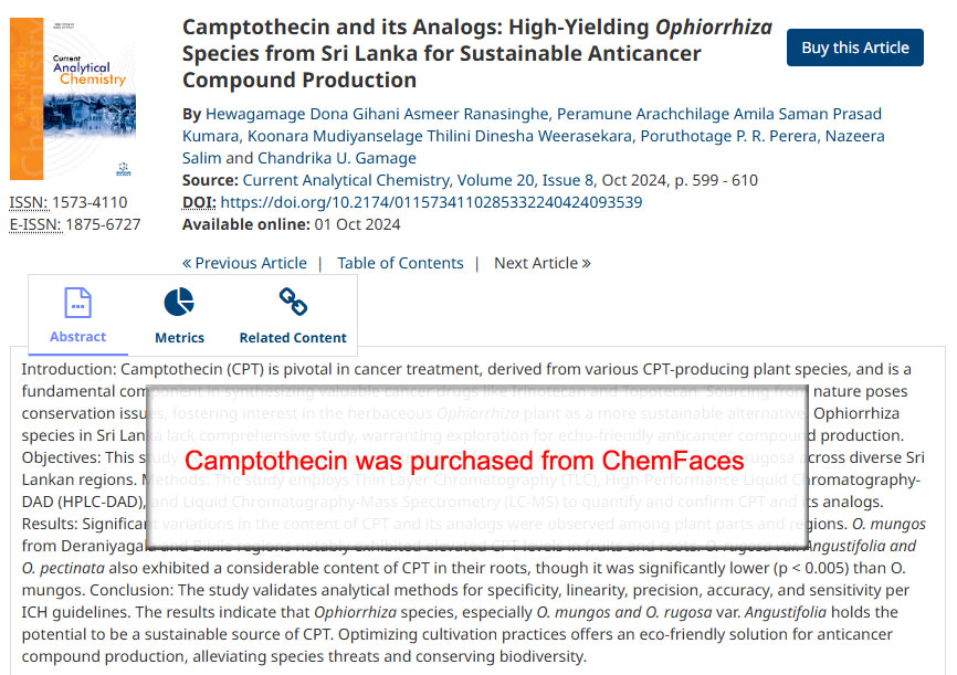 Camptothecin and its Analogs: High-Yielding Ophiorrhiza Species from Sri Lanka for Sustainable Anticancer Compound Production