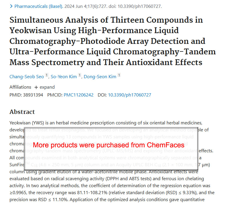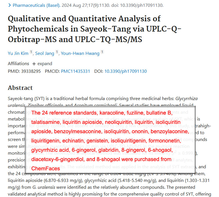 The 24 reference standards, karacoline, fuziline, bullatine B, talatisamine, liquiritin apioside, neoliquiritin, liquiritin, isoliquiritin apioside, benzoylmesaconine, isoliquiritin, ononin, benzoylaconine, liquiritigenin, echinatin, genistein, isoliquiritigenin, formononetin, glycyrrhizic acid, 6-gingerol, glabridin, 8-gingerol, 6-shogaol, diacetoxy-6-gingerdiol, and 8-shogaol were purchased from ChemFaces