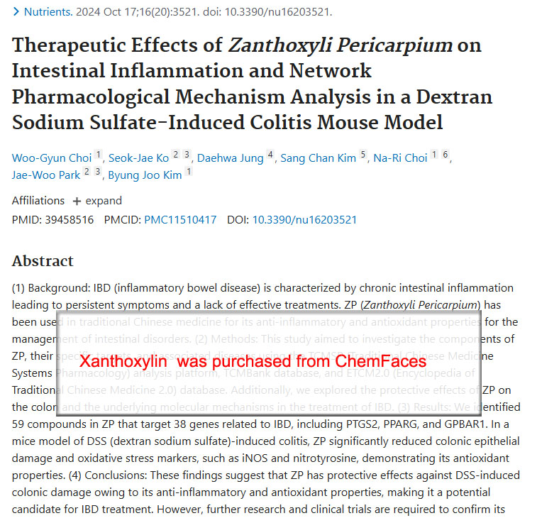 Therapeutic Effects of Zanthoxyli Pericarpium on Intestinal Inflammation and Network Pharmacological Mechanism Analysis in a Dextran Sodium Sulfate-Induced Colitis Mouse Model