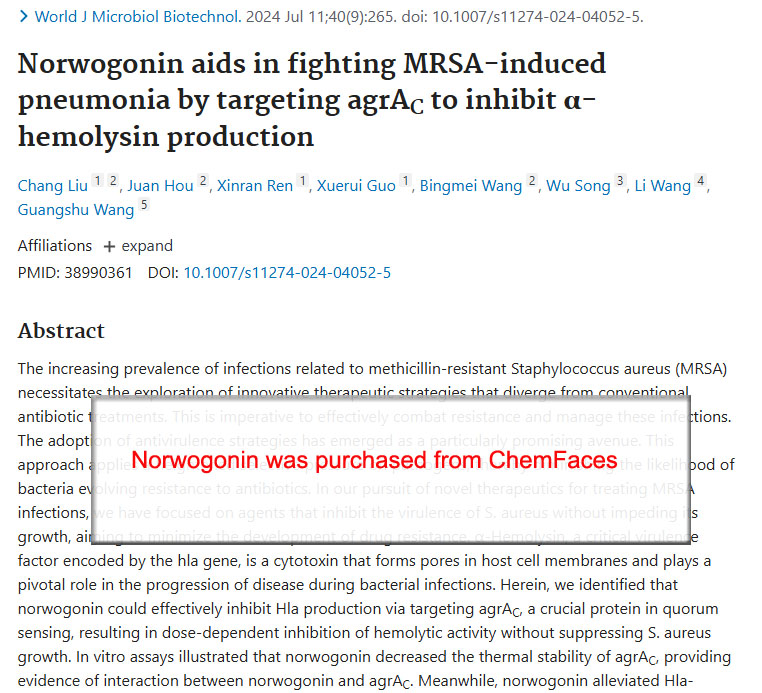 Norwogonin aids in fighting MRSA-induced pneumonia by targeting agrAC to inhibit ホア-hemolysin production