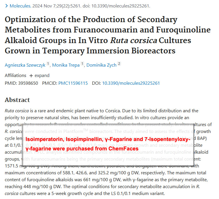 Isoimperatorin, Isopimpinellin, ホウ-Fagarine and 7-Isopentenyloxy-ホウ-fagarine were purchased from ChemFaces